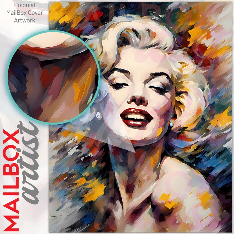 With this Smiling Marilyn Monroe colonial mailbox cover it’s pretty easy to convert your mailbox to a special and unique item. These covers require a flat surface, so they work with colonial mailboxes that do not have any embossed decoration or signs. Magnetic mailbox covers work with steel colonial boxes only, while self-adhesive vinyl covers are available for aluminum, plastic and steel boxes. We also offer both self-adhesive and magnetic covers with regular opaque white vinyl or reflective vinyl, which works similarly to license plates or road signs. The reflective option makes the entire cover’s surface reflective, ensuring visibility at night. In case your mailbox doesn’t work with these covers, you can purchase the preinstalled cover on a brand new mailbox as well. Also, you can create your custom colonial mailbox cover using you own pictures, adding your name, street number, etc.