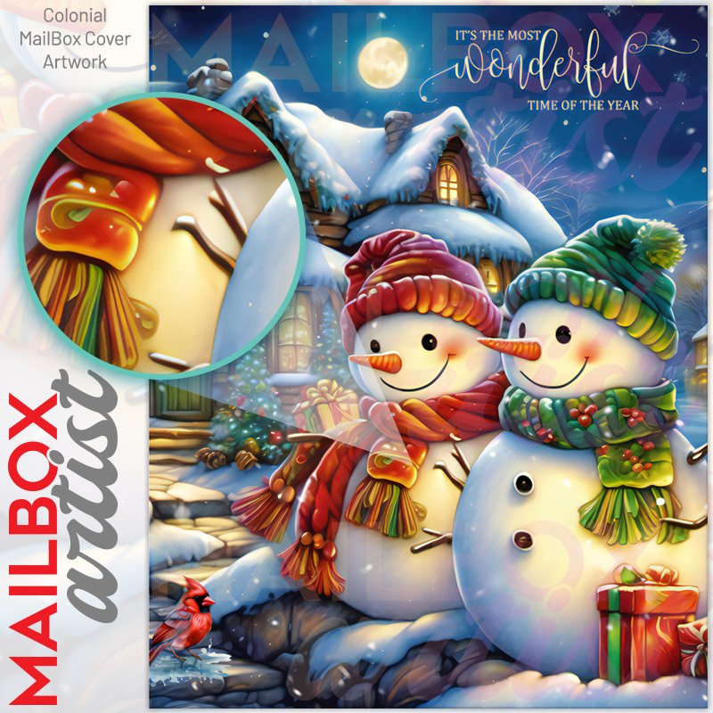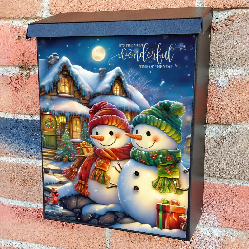 With this Snowman Couple at the Cottage colonial mailbox cover it’s pretty easy to convert your mailbox to a special and unique item. These covers require a flat surface, so they work with colonial mailboxes that do not have any embossed decoration or signs. Magnetic mailbox covers work with steel colonial boxes only, while self-adhesive vinyl covers are available for aluminum, plastic and steel boxes. We also offer both self-adhesive and magnetic covers with regular opaque white vinyl or reflective vinyl, which works similarly to license plates or road signs. The reflective option makes the entire cover’s surface reflective, ensuring visibility at night. In case your mailbox doesn’t work with these covers, you can purchase the preinstalled cover on a brand new mailbox as well. Also, you can create your custom colonial mailbox cover using you own pictures, adding your name, street number, etc.
