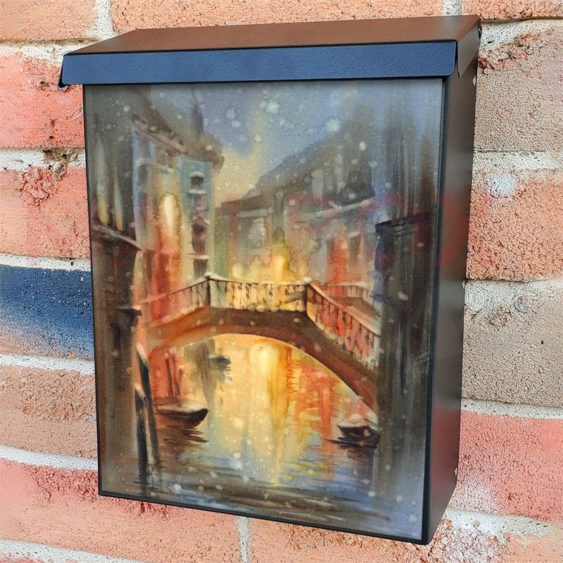 With this Snowy Evening in Venice colonial mailbox cover it’s pretty easy to convert your mailbox to a special and unique item. These covers require a flat surface, so they work with colonial mailboxes that do not have any embossed decoration or signs. Magnetic mailbox covers work with steel colonial boxes only, while self-adhesive vinyl covers are available for aluminum, plastic and steel boxes. We also offer both self-adhesive and magnetic covers with regular opaque white vinyl or reflective vinyl, which works similarly to license plates or road signs. The reflective option makes the entire cover’s surface reflective, ensuring visibility at night. In case your mailbox doesn’t work with these covers, you can purchase the preinstalled cover on a brand new mailbox as well. Also, you can create your custom colonial mailbox cover using you own pictures, adding your name, street number, etc.