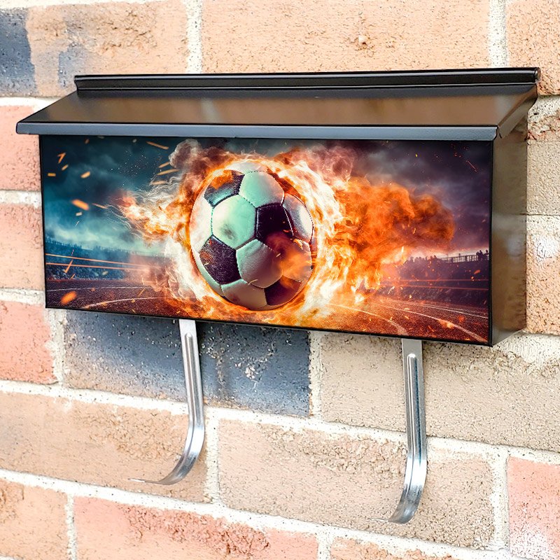Applying your Soccer Football Ball In Explosion townhouse / ranch mailbox cover it’s pretty easy to convert your mailbox to a special and unique item. These covers require a flat surface, so they work with townhouse / ranch mailboxes that do not have any embossed decoration or signs. Magnetic mailbox covers work with steel boxes, for aluminum and plastic boxes we offer the self-adhesive vinyl covers. In case your mailbox doesn’t work with these covers, you can purchase the preinstalled cover on a brand new mailbox as well. Also, you can create your custom townhouse / ranch mailbox cover using you own pictures, adding your name, street number, etc.