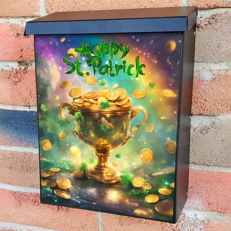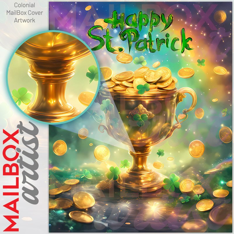 With this St. Patrick Day Cup with Gold colonial mailbox cover it’s pretty easy to convert your mailbox to a special and unique item. These covers require a flat surface, so they work with colonial mailboxes that do not have any embossed decoration or signs. Magnetic mailbox covers work with steel colonial boxes only, while self-adhesive vinyl covers are available for aluminum, plastic and steel boxes. We also offer both self-adhesive and magnetic covers with regular opaque white vinyl or reflective vinyl, which works similarly to license plates or road signs. The reflective option makes the entire cover’s surface reflective, ensuring visibility at night. In case your mailbox doesn’t work with these covers, you can purchase the preinstalled cover on a brand new mailbox as well. Also, you can create your custom colonial mailbox cover using you own pictures, adding your name, street number, etc.