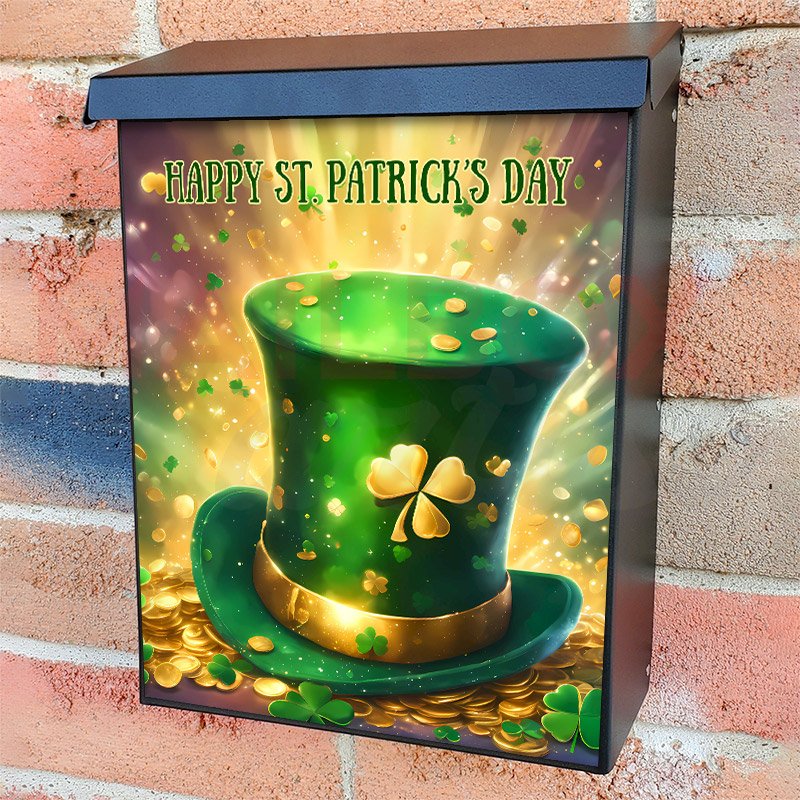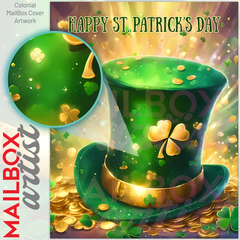 With this St. Patrick Day Top Hat colonial mailbox cover it’s pretty easy to convert your mailbox to a special and unique item. These covers require a flat surface, so they work with colonial mailboxes that do not have any embossed decoration or signs. Magnetic mailbox covers work with steel colonial boxes only, while self-adhesive vinyl covers are available for aluminum, plastic and steel boxes. We also offer both self-adhesive and magnetic covers with regular opaque white vinyl or reflective vinyl, which works similarly to license plates or road signs. The reflective option makes the entire cover’s surface reflective, ensuring visibility at night. In case your mailbox doesn’t work with these covers, you can purchase the preinstalled cover on a brand new mailbox as well. Also, you can create your custom colonial mailbox cover using you own pictures, adding your name, street number, etc.