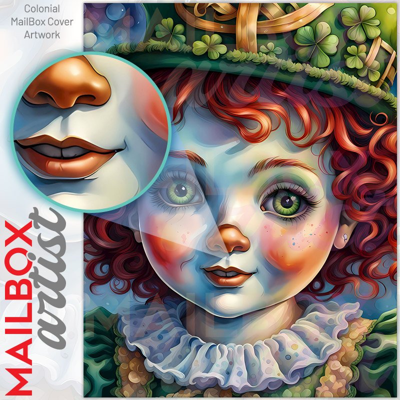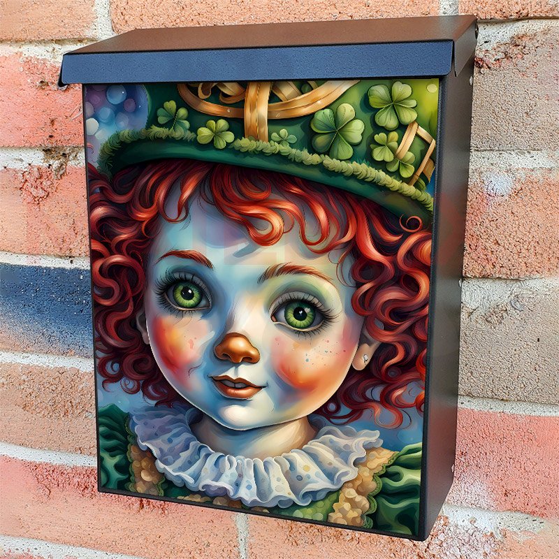 With this St. Patrick Raggedy Ann colonial mailbox cover it’s pretty easy to convert your mailbox to a special and unique item. These covers require a flat surface, so they work with colonial mailboxes that do not have any embossed decoration or signs. Magnetic mailbox covers work with steel colonial boxes only, while self-adhesive vinyl covers are available for aluminum, plastic and steel boxes. We also offer both self-adhesive and magnetic covers with regular opaque white vinyl or reflective vinyl, which works similarly to license plates or road signs. The reflective option makes the entire cover’s surface reflective, ensuring visibility at night. In case your mailbox doesn’t work with these covers, you can purchase the preinstalled cover on a brand new mailbox as well. Also, you can create your custom colonial mailbox cover using you own pictures, adding your name, street number, etc.