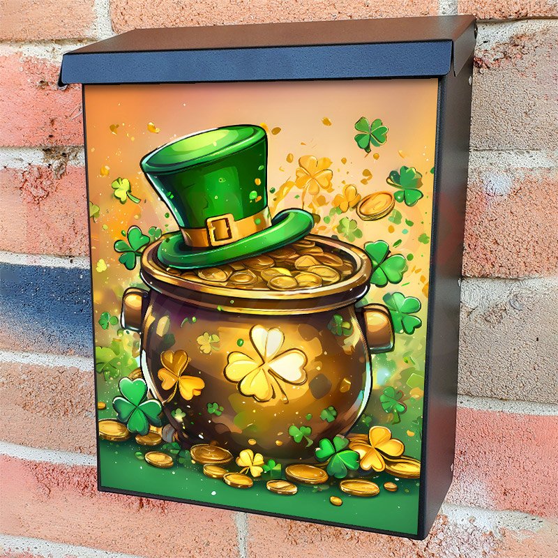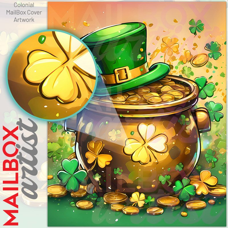 With this St. Patrick’s Day Gold Pot colonial mailbox cover it’s pretty easy to convert your mailbox to a special and unique item. These covers require a flat surface, so they work with colonial mailboxes that do not have any embossed decoration or signs. Magnetic mailbox covers work with steel colonial boxes only, while self-adhesive vinyl covers are available for aluminum, plastic and steel boxes. We also offer both self-adhesive and magnetic covers with regular opaque white vinyl or reflective vinyl, which works similarly to license plates or road signs. The reflective option makes the entire cover’s surface reflective, ensuring visibility at night. In case your mailbox doesn’t work with these covers, you can purchase the preinstalled cover on a brand new mailbox as well. Also, you can create your custom colonial mailbox cover using you own pictures, adding your name, street number, etc.