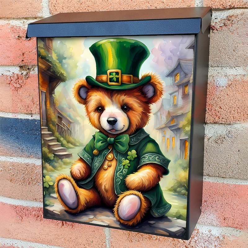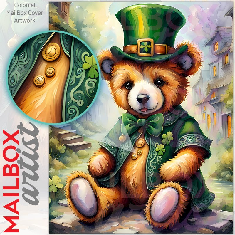 With this St. Patrick’s Day Irish Teddy Bear colonial mailbox cover it’s pretty easy to convert your mailbox to a special and unique item. These covers require a flat surface, so they work with colonial mailboxes that do not have any embossed decoration or signs. Magnetic mailbox covers work with steel colonial boxes only, while self-adhesive vinyl covers are available for aluminum, plastic and steel boxes. We also offer both self-adhesive and magnetic covers with regular opaque white vinyl or reflective vinyl, which works similarly to license plates or road signs. The reflective option makes the entire cover’s surface reflective, ensuring visibility at night. In case your mailbox doesn’t work with these covers, you can purchase the preinstalled cover on a brand new mailbox as well. Also, you can create your custom colonial mailbox cover using you own pictures, adding your name, street number, etc.