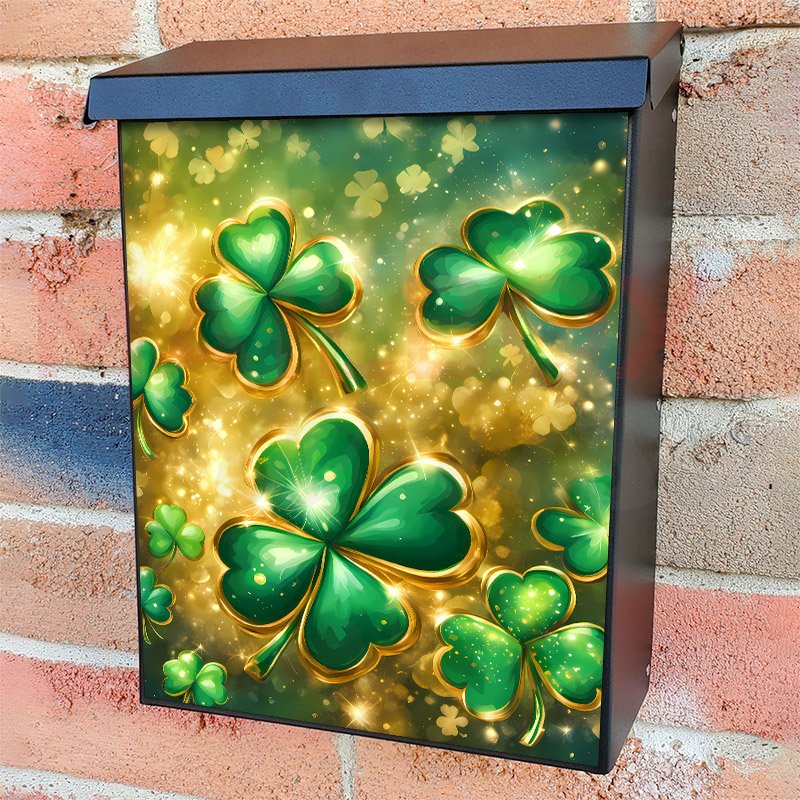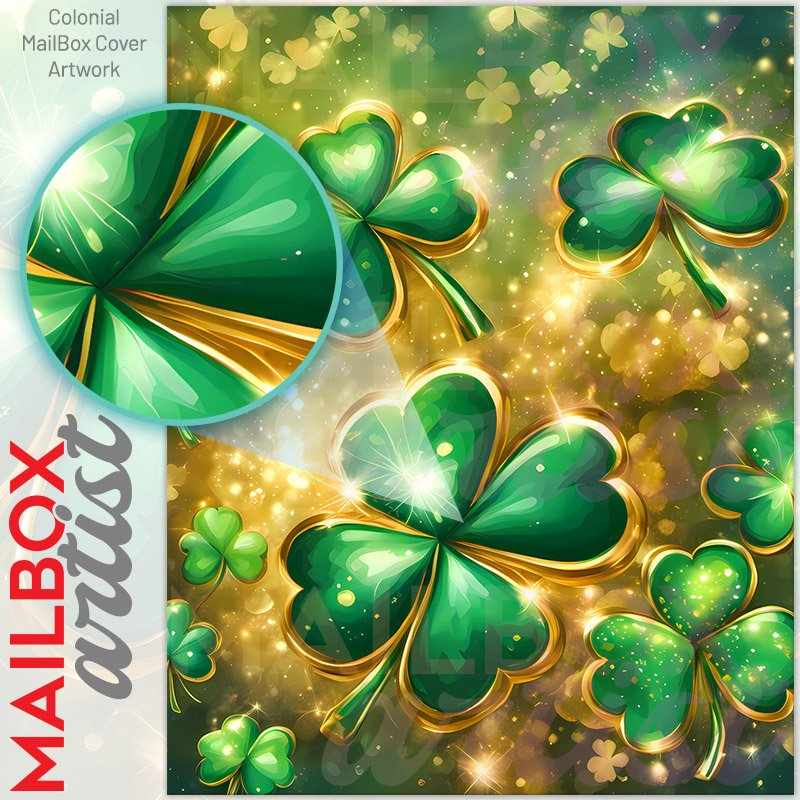 With this St. Patrick’s Day Shamrocks and Gold colonial mailbox cover it’s pretty easy to convert your mailbox to a special and unique item. These covers require a flat surface, so they work with colonial mailboxes that do not have any embossed decoration or signs. Magnetic mailbox covers work with steel colonial boxes only, while self-adhesive vinyl covers are available for aluminum, plastic and steel boxes. We also offer both self-adhesive and magnetic covers with regular opaque white vinyl or reflective vinyl, which works similarly to license plates or road signs. The reflective option makes the entire cover’s surface reflective, ensuring visibility at night. In case your mailbox doesn’t work with these covers, you can purchase the preinstalled cover on a brand new mailbox as well. Also, you can create your custom colonial mailbox cover using you own pictures, adding your name, street number, etc.