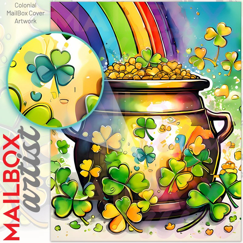 With this St. Patty Pot of Gold colonial mailbox cover it’s pretty easy to convert your mailbox to a special and unique item. These covers require a flat surface, so they work with colonial mailboxes that do not have any embossed decoration or signs. Magnetic mailbox covers work with steel colonial boxes only, while self-adhesive vinyl covers are available for aluminum, plastic and steel boxes. We also offer both self-adhesive and magnetic covers with regular opaque white vinyl or reflective vinyl, which works similarly to license plates or road signs. The reflective option makes the entire cover’s surface reflective, ensuring visibility at night. In case your mailbox doesn’t work with these covers, you can purchase the preinstalled cover on a brand new mailbox as well. Also, you can create your custom colonial mailbox cover using you own pictures, adding your name, street number, etc.
