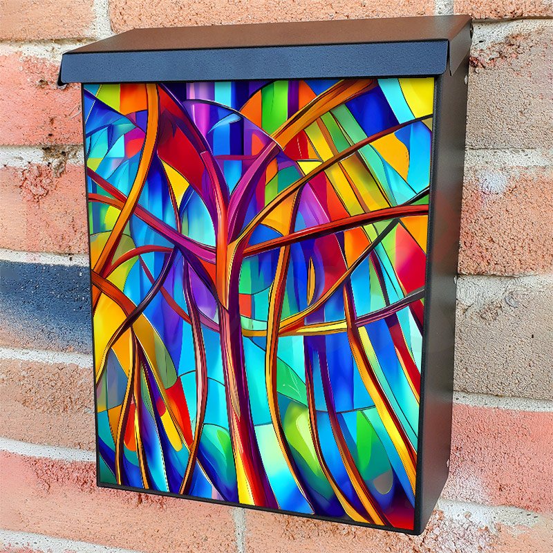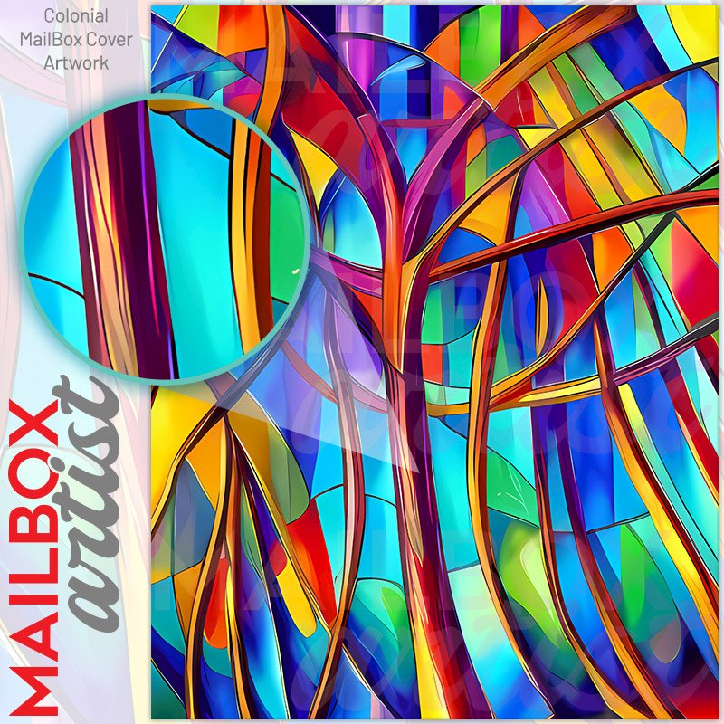 With this Stained Glass Abstract Pattern colonial mailbox cover it’s pretty easy to convert your mailbox to a special and unique item. These covers require a flat surface, so they work with colonial mailboxes that do not have any embossed decoration or signs. Magnetic mailbox covers work with steel colonial boxes only, while self-adhesive vinyl covers are available for aluminum, plastic and steel boxes. We also offer both self-adhesive and magnetic covers with regular opaque white vinyl or reflective vinyl, which works similarly to license plates or road signs. The reflective option makes the entire cover’s surface reflective, ensuring visibility at night. In case your mailbox doesn’t work with these covers, you can purchase the preinstalled cover on a brand new mailbox as well. Also, you can create your custom colonial mailbox cover using you own pictures, adding your name, street number, etc.