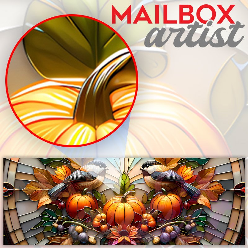 This Stained Glass Autumn Chickadees with Pumpkins mailbox design was created by Krisztina Soos