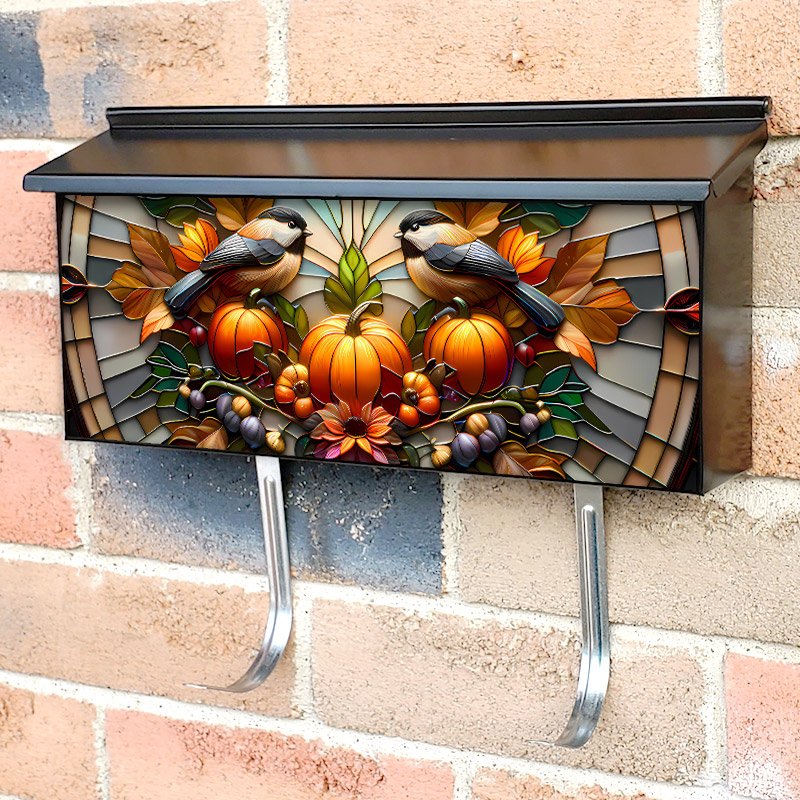 Stained Glass Autumn Chickadees with Pumpkins Townhouse Mailbox Cover