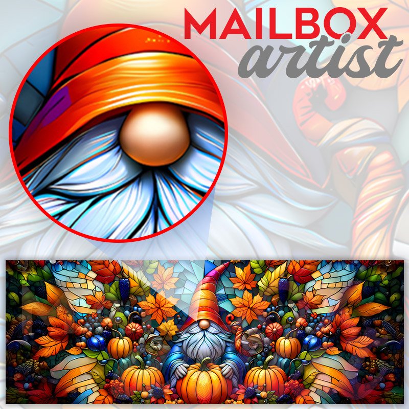 This Stained Glass Autumn Gnome and Pumpkins mailbox design was created by Krisztina Soos