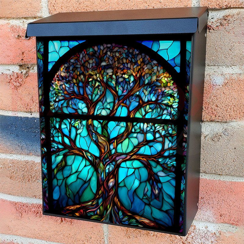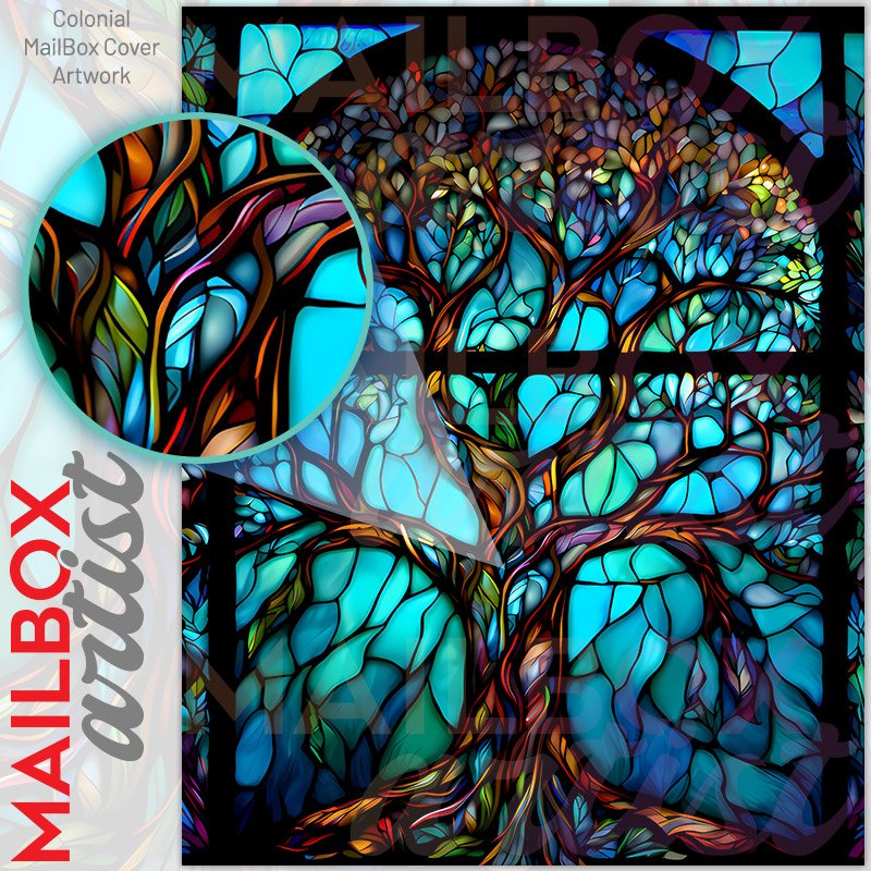 With this Stained Glass Beautiful Tree colonial mailbox cover it’s pretty easy to convert your mailbox to a special and unique item. These covers require a flat surface, so they work with colonial mailboxes that do not have any embossed decoration or signs. Magnetic mailbox covers work with steel colonial boxes only, while self-adhesive vinyl covers are available for aluminum, plastic and steel boxes. We also offer both self-adhesive and magnetic covers with regular opaque white vinyl or reflective vinyl, which works similarly to license plates or road signs. The reflective option makes the entire cover’s surface reflective, ensuring visibility at night. In case your mailbox doesn’t work with these covers, you can purchase the preinstalled cover on a brand new mailbox as well. Also, you can create your custom colonial mailbox cover using you own pictures, adding your name, street number, etc.