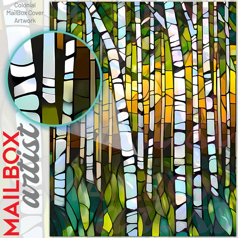 With this Stained Glass Birch Trees colonial mailbox cover it’s pretty easy to convert your mailbox to a special and unique item. These covers require a flat surface, so they work with colonial mailboxes that do not have any embossed decoration or signs. Magnetic mailbox covers work with steel colonial boxes only, while self-adhesive vinyl covers are available for aluminum, plastic and steel boxes. We also offer both self-adhesive and magnetic covers with regular opaque white vinyl or reflective vinyl, which works similarly to license plates or road signs. The reflective option makes the entire cover’s surface reflective, ensuring visibility at night. In case your mailbox doesn’t work with these covers, you can purchase the preinstalled cover on a brand new mailbox as well. Also, you can create your custom colonial mailbox cover using you own pictures, adding your name, street number, etc.
