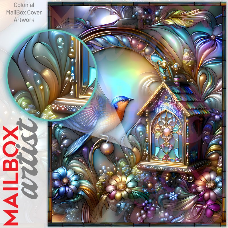 With this Stained Glass Bird, Birdhouse and Flowers colonial mailbox cover it’s pretty easy to convert your mailbox to a special and unique item. These covers require a flat surface, so they work with colonial mailboxes that do not have any embossed decoration or signs. Magnetic mailbox covers work with steel colonial boxes only, while self-adhesive vinyl covers are available for aluminum, plastic and steel boxes. We also offer both self-adhesive and magnetic covers with regular opaque white vinyl or reflective vinyl, which works similarly to license plates or road signs. The reflective option makes the entire cover’s surface reflective, ensuring visibility at night. In case your mailbox doesn’t work with these covers, you can purchase the preinstalled cover on a brand new mailbox as well. Also, you can create your custom colonial mailbox cover using you own pictures, adding your name, street number, etc.