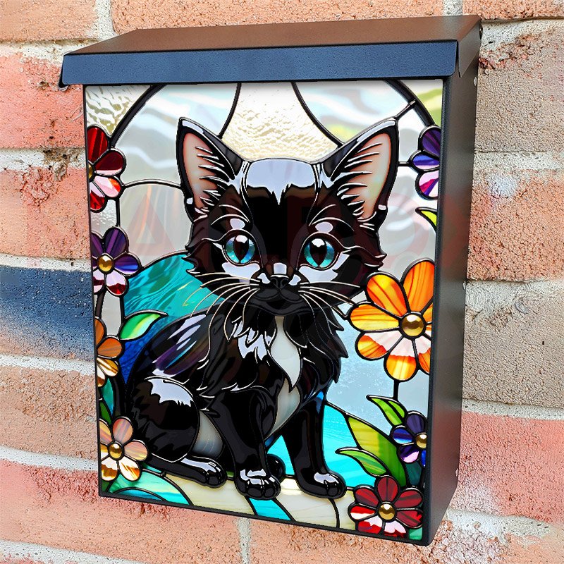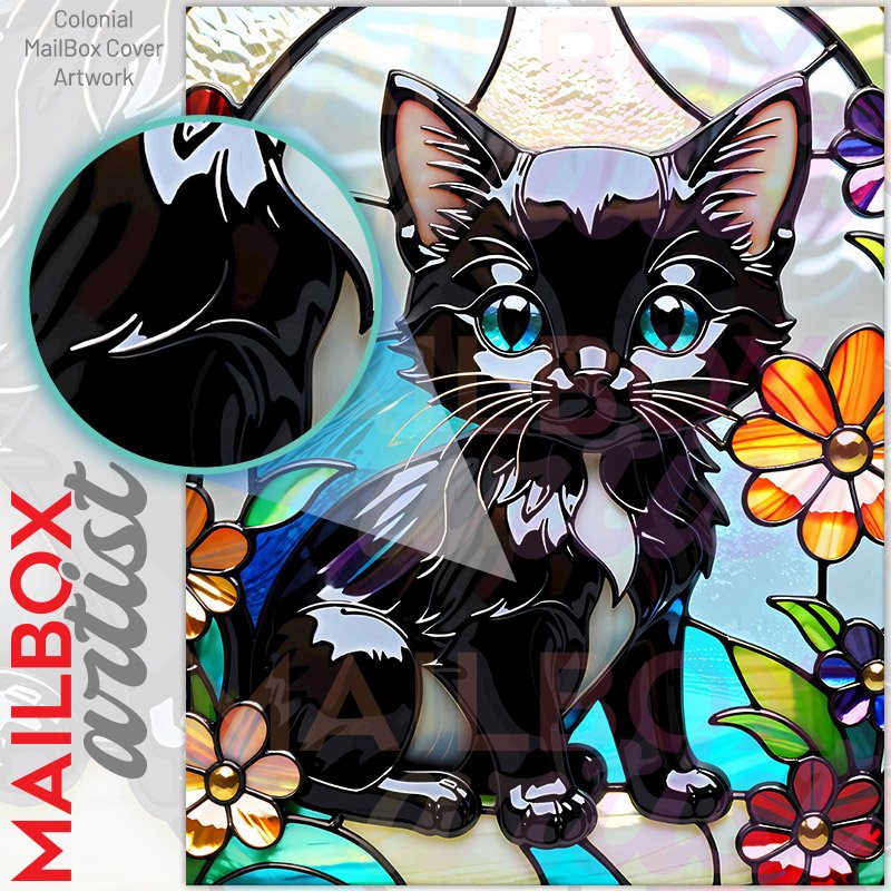 With this Stained Glass Black Kitten colonial mailbox cover it’s pretty easy to convert your mailbox to a special and unique item. These covers require a flat surface, so they work with colonial mailboxes that do not have any embossed decoration or signs. Magnetic mailbox covers work with steel colonial boxes only, while self-adhesive vinyl covers are available for aluminum, plastic and steel boxes. We also offer both self-adhesive and magnetic covers with regular opaque white vinyl or reflective vinyl, which works similarly to license plates or road signs. The reflective option makes the entire cover’s surface reflective, ensuring visibility at night. In case your mailbox doesn’t work with these covers, you can purchase the preinstalled cover on a brand new mailbox as well. Also, you can create your custom colonial mailbox cover using you own pictures, adding your name, street number, etc.