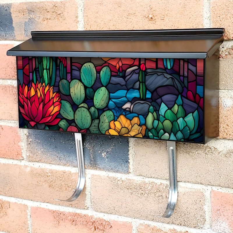 Applying your Stained Glass Blooming Desert Design townhouse / ranch mailbox cover it’s pretty easy to convert your mailbox to a special and unique item. These covers require a flat surface, so they work with townhouse / ranch mailboxes that do not have any embossed decoration or signs. Magnetic mailbox covers work with steel boxes, for aluminum and plastic boxes we offer the self-adhesive vinyl covers. In case your mailbox doesn’t work with these covers, you can purchase the preinstalled cover on a brand new mailbox as well. Also, you can create your custom townhouse / ranch mailbox cover using you own pictures, adding your name, street number, etc.