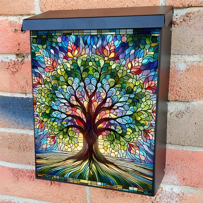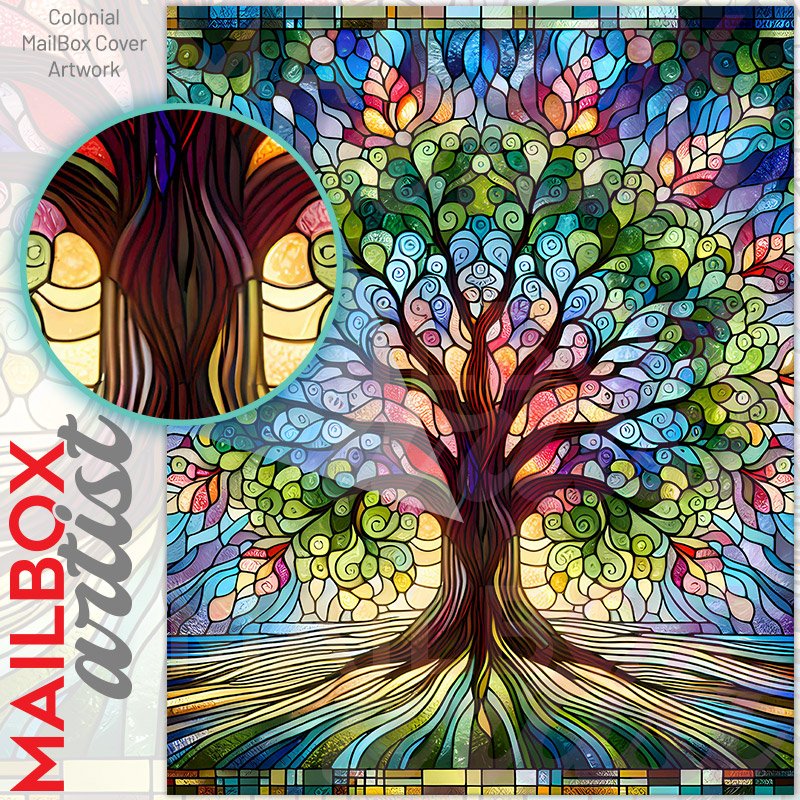 With this Stained Glass Blooming Tree colonial mailbox cover it’s pretty easy to convert your mailbox to a special and unique item. These covers require a flat surface, so they work with colonial mailboxes that do not have any embossed decoration or signs. Magnetic mailbox covers work with steel colonial boxes only, while self-adhesive vinyl covers are available for aluminum, plastic and steel boxes. We also offer both self-adhesive and magnetic covers with regular opaque white vinyl or reflective vinyl, which works similarly to license plates or road signs. The reflective option makes the entire cover’s surface reflective, ensuring visibility at night. In case your mailbox doesn’t work with these covers, you can purchase the preinstalled cover on a brand new mailbox as well. Also, you can create your custom colonial mailbox cover using you own pictures, adding your name, street number, etc.