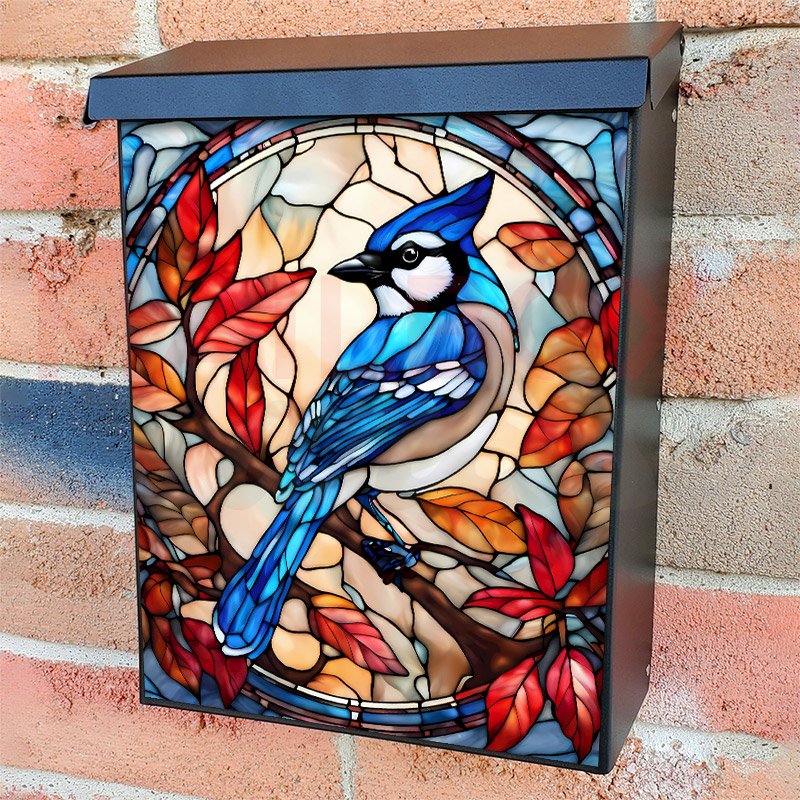 With this Stained Glass Blue Jay on the Tree colonial mailbox cover it’s pretty easy to convert your mailbox to a special and unique item. These covers require a flat surface, so they work with colonial mailboxes that do not have any embossed decoration or signs. Magnetic mailbox covers work with steel colonial boxes only, while self-adhesive vinyl covers are available for aluminum, plastic and steel boxes. We also offer both self-adhesive and magnetic covers with regular opaque white vinyl or reflective vinyl, which works similarly to license plates or road signs. The reflective option makes the entire cover’s surface reflective, ensuring visibility at night. In case your mailbox doesn’t work with these covers, you can purchase the preinstalled cover on a brand new mailbox as well. Also, you can create your custom colonial mailbox cover using you own pictures, adding your name, street number, etc.