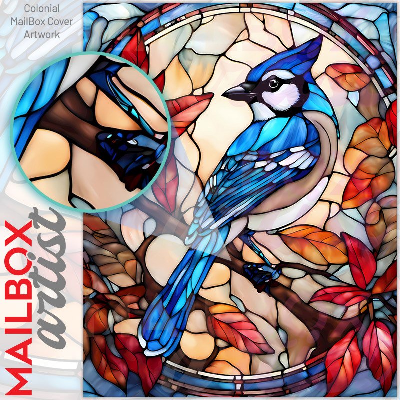 Stained Glass Blue Jay on the Tree Colonial Mailbox Cover