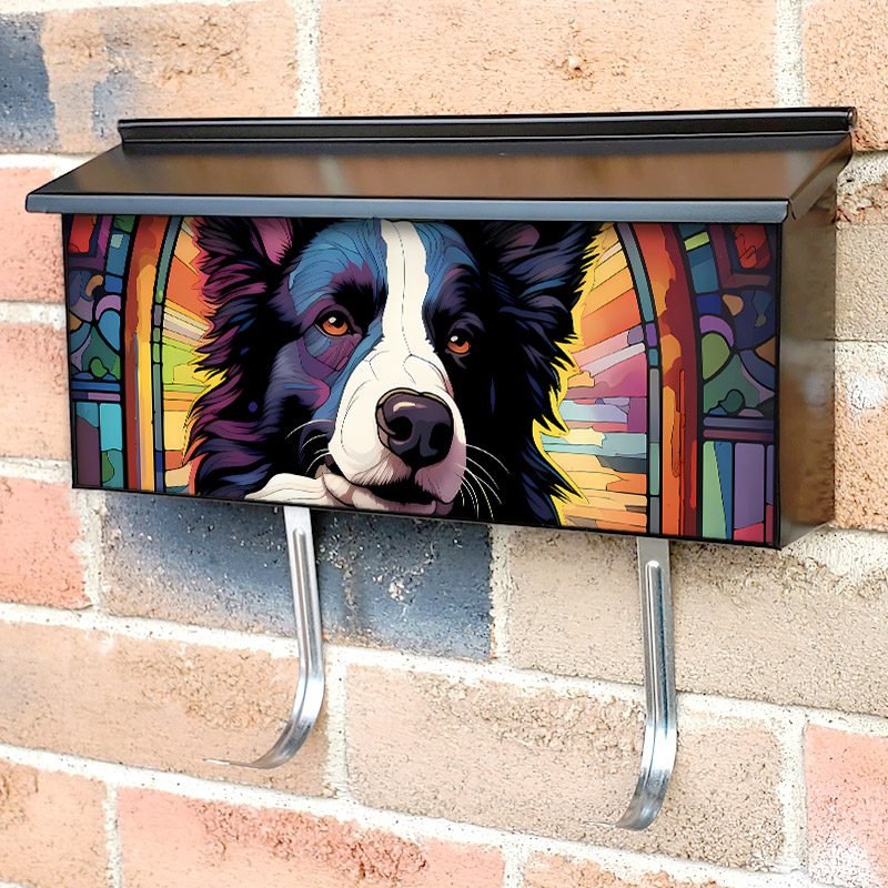 Applying your Stained Glass Border Collie Design townhouse / ranch mailbox cover it’s pretty easy to convert your mailbox to a special and unique item. These covers require a flat surface, so they work with townhouse / ranch mailboxes that do not have any embossed decoration or signs. Magnetic mailbox covers work with steel boxes, for aluminum and plastic boxes we offer the self-adhesive vinyl covers. In case your mailbox doesn’t work with these covers, you can purchase the preinstalled cover on a brand new mailbox as well. Also, you can create your custom townhouse / ranch mailbox cover using you own pictures, adding your name, street number, etc.