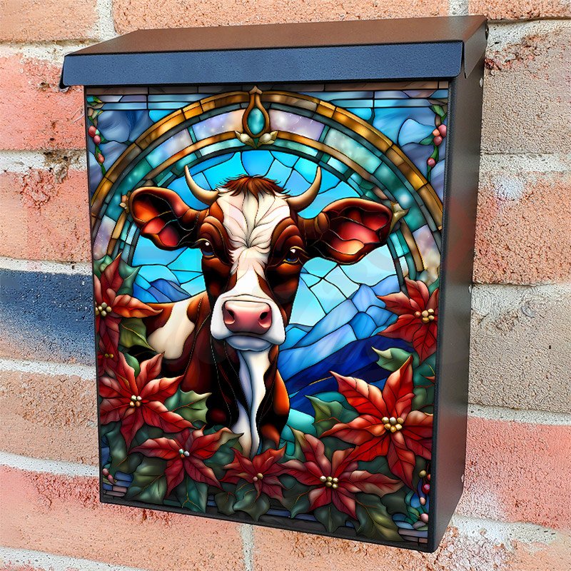 With this Stained Glass Brown Christmas Cow colonial mailbox cover it’s pretty easy to convert your mailbox to a special and unique item. These covers require a flat surface, so they work with colonial mailboxes that do not have any embossed decoration or signs. Magnetic mailbox covers work with steel colonial boxes only, while self-adhesive vinyl covers are available for aluminum, plastic and steel boxes. We also offer both self-adhesive and magnetic covers with regular opaque white vinyl or reflective vinyl, which works similarly to license plates or road signs. The reflective option makes the entire cover’s surface reflective, ensuring visibility at night. In case your mailbox doesn’t work with these covers, you can purchase the preinstalled cover on a brand new mailbox as well. Also, you can create your custom colonial mailbox cover using you own pictures, adding your name, street number, etc.
