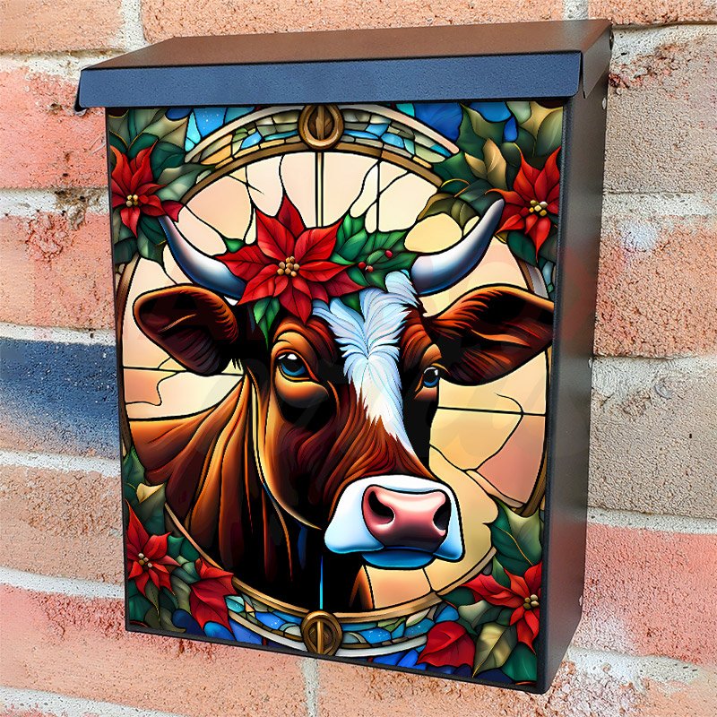 With this Stained Glass Brown Cow Portrait colonial mailbox cover it’s pretty easy to convert your mailbox to a special and unique item. These covers require a flat surface, so they work with colonial mailboxes that do not have any embossed decoration or signs. Magnetic mailbox covers work with steel colonial boxes only, while self-adhesive vinyl covers are available for aluminum, plastic and steel boxes. We also offer both self-adhesive and magnetic covers with regular opaque white vinyl or reflective vinyl, which works similarly to license plates or road signs. The reflective option makes the entire cover’s surface reflective, ensuring visibility at night. In case your mailbox doesn’t work with these covers, you can purchase the preinstalled cover on a brand new mailbox as well. Also, you can create your custom colonial mailbox cover using you own pictures, adding your name, street number, etc.