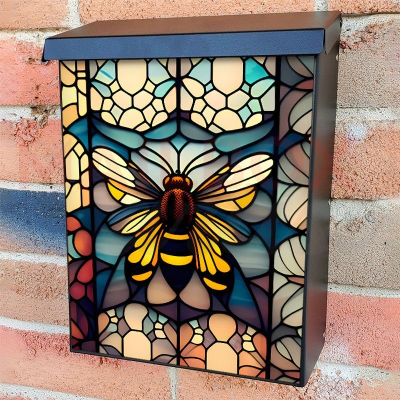With this Stained Glass Bumblebee Design colonial mailbox cover it’s pretty easy to convert your mailbox to a special and unique item. These covers require a flat surface, so they work with colonial mailboxes that do not have any embossed decoration or signs. Magnetic mailbox covers work with steel colonial boxes only, while self-adhesive vinyl covers are available for aluminum, plastic and steel boxes. We also offer both self-adhesive and magnetic covers with regular opaque white vinyl or reflective vinyl, which works similarly to license plates or road signs. The reflective option makes the entire cover’s surface reflective, ensuring visibility at night. In case your mailbox doesn’t work with these covers, you can purchase the preinstalled cover on a brand new mailbox as well. Also, you can create your custom colonial mailbox cover using you own pictures, adding your name, street number, etc.