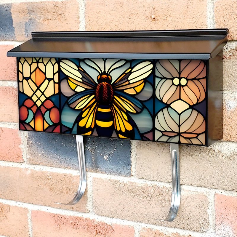 Applying your Stained Glass Bumblebee Design townhouse / ranch mailbox cover it’s pretty easy to convert your mailbox to a special and unique item. These covers require a flat surface, so they work with townhouse / ranch mailboxes that do not have any embossed decoration or signs. Magnetic mailbox covers work with steel boxes, for aluminum and plastic boxes we offer the self-adhesive vinyl covers. In case your mailbox doesn’t work with these covers, you can purchase the preinstalled cover on a brand new mailbox as well. Also, you can create your custom townhouse / ranch mailbox cover using you own pictures, adding your name, street number, etc.