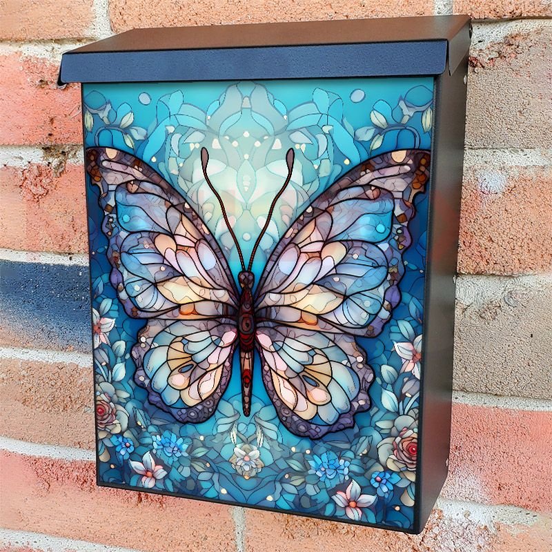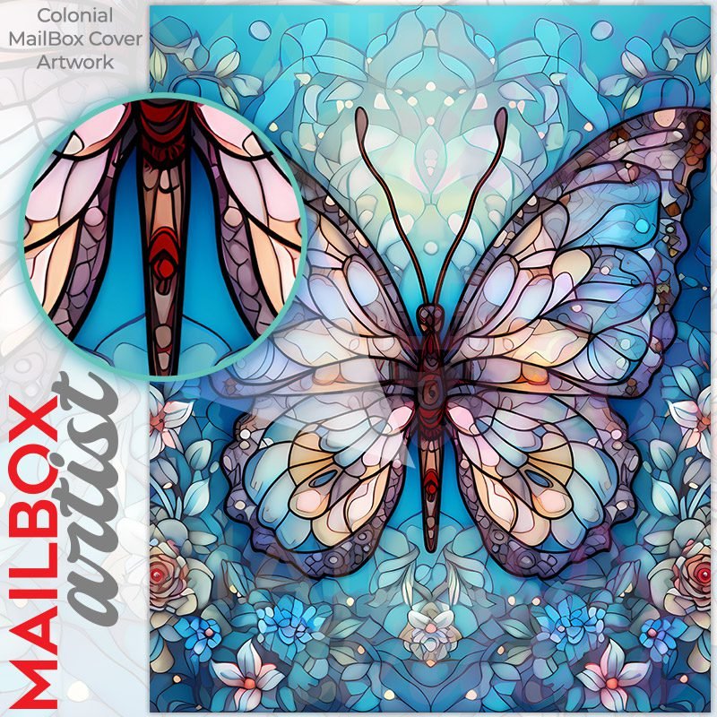 With this Stained Glass Butterfly and Roses Design colonial mailbox cover it’s pretty easy to convert your mailbox to a special and unique item. These covers require a flat surface, so they work with colonial mailboxes that do not have any embossed decoration or signs. Magnetic mailbox covers work with steel colonial boxes only, while self-adhesive vinyl covers are available for aluminum, plastic and steel boxes. We also offer both self-adhesive and magnetic covers with regular opaque white vinyl or reflective vinyl, which works similarly to license plates or road signs. The reflective option makes the entire cover’s surface reflective, ensuring visibility at night. In case your mailbox doesn’t work with these covers, you can purchase the preinstalled cover on a brand new mailbox as well. Also, you can create your custom colonial mailbox cover using you own pictures, adding your name, street number, etc.