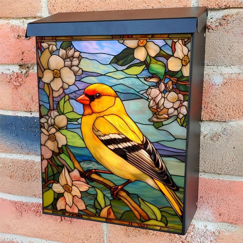 With this Stained Glass Canary Design colonial mailbox cover it’s pretty easy to convert your mailbox to a special and unique item. These covers require a flat surface, so they work with colonial mailboxes that do not have any embossed decoration or signs. Magnetic mailbox covers work with steel colonial boxes only, while self-adhesive vinyl covers are available for aluminum, plastic and steel boxes. We also offer both self-adhesive and magnetic covers with regular opaque white vinyl or reflective vinyl, which works similarly to license plates or road signs. The reflective option makes the entire cover’s surface reflective, ensuring visibility at night. In case your mailbox doesn’t work with these covers, you can purchase the preinstalled cover on a brand new mailbox as well. Also, you can create your custom colonial mailbox cover using you own pictures, adding your name, street number, etc.