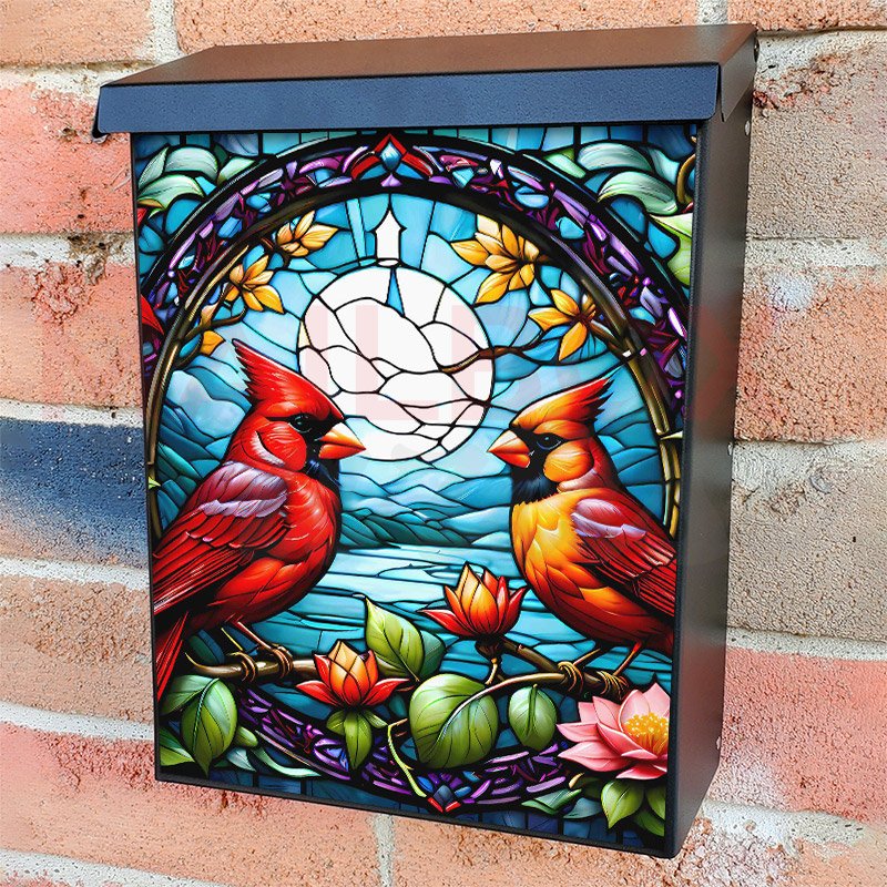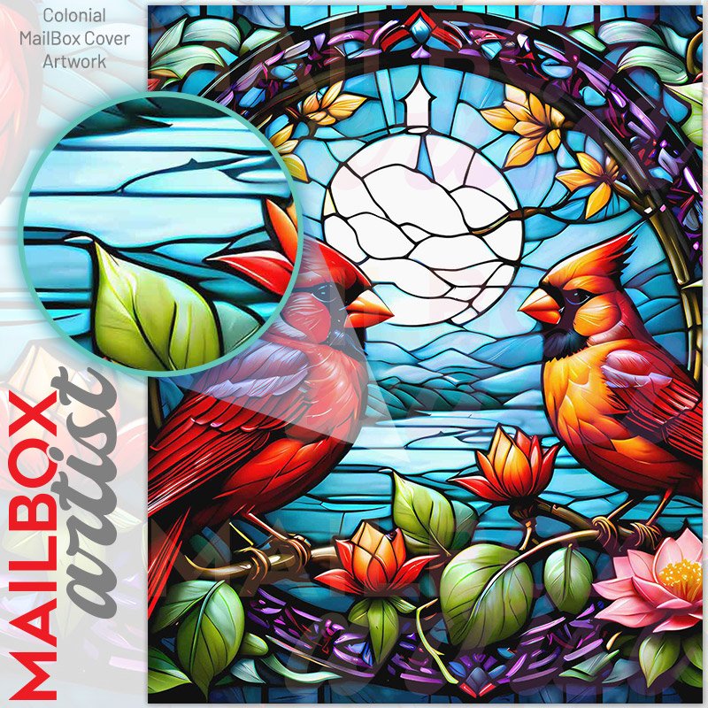 With this Stained Glass Cardinals and Flowers colonial mailbox cover it’s pretty easy to convert your mailbox to a special and unique item. These covers require a flat surface, so they work with colonial mailboxes that do not have any embossed decoration or signs. Magnetic mailbox covers work with steel colonial boxes only, while self-adhesive vinyl covers are available for aluminum, plastic and steel boxes. We also offer both self-adhesive and magnetic covers with regular opaque white vinyl or reflective vinyl, which works similarly to license plates or road signs. The reflective option makes the entire cover’s surface reflective, ensuring visibility at night. In case your mailbox doesn’t work with these covers, you can purchase the preinstalled cover on a brand new mailbox as well. Also, you can create your custom colonial mailbox cover using you own pictures, adding your name, street number, etc.