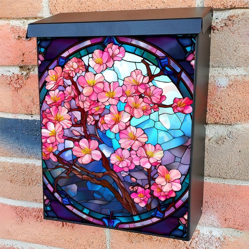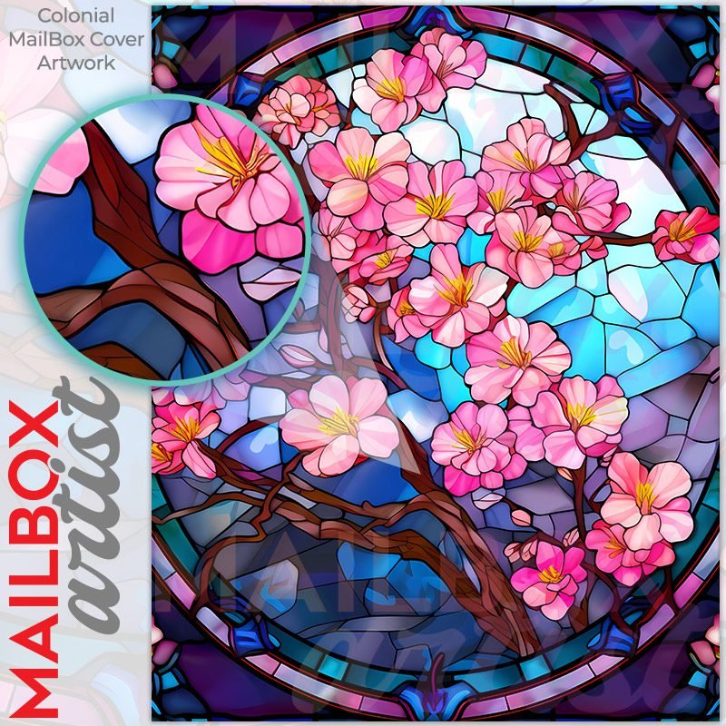With this Stained Glass Cherry Tree Design colonial mailbox cover it’s pretty easy to convert your mailbox to a special and unique item. These covers require a flat surface, so they work with colonial mailboxes that do not have any embossed decoration or signs. Magnetic mailbox covers work with steel colonial boxes only, while self-adhesive vinyl covers are available for aluminum, plastic and steel boxes. We also offer both self-adhesive and magnetic covers with regular opaque white vinyl or reflective vinyl, which works similarly to license plates or road signs. The reflective option makes the entire cover’s surface reflective, ensuring visibility at night. In case your mailbox doesn’t work with these covers, you can purchase the preinstalled cover on a brand new mailbox as well. Also, you can create your custom colonial mailbox cover using you own pictures, adding your name, street number, etc.