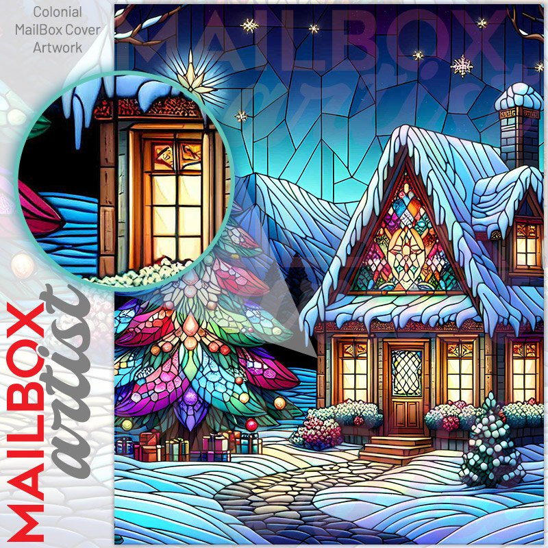 With this Stained Glass Christmas Cottage colonial mailbox cover it’s pretty easy to convert your mailbox to a special and unique item. These covers require a flat surface, so they work with colonial mailboxes that do not have any embossed decoration or signs. Magnetic mailbox covers work with steel colonial boxes only, while self-adhesive vinyl covers are available for aluminum, plastic and steel boxes. We also offer both self-adhesive and magnetic covers with regular opaque white vinyl or reflective vinyl, which works similarly to license plates or road signs. The reflective option makes the entire cover’s surface reflective, ensuring visibility at night. In case your mailbox doesn’t work with these covers, you can purchase the preinstalled cover on a brand new mailbox as well. Also, you can create your custom colonial mailbox cover using you own pictures, adding your name, street number, etc.