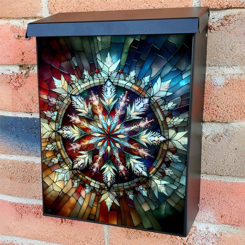 With this Stained Glass Christmas Snowflake colonial mailbox cover it’s pretty easy to convert your mailbox to a special and unique item. These covers require a flat surface, so they work with colonial mailboxes that do not have any embossed decoration or signs. Magnetic mailbox covers work with steel colonial boxes only, while self-adhesive vinyl covers are available for aluminum, plastic and steel boxes. We also offer both self-adhesive and magnetic covers with regular opaque white vinyl or reflective vinyl, which works similarly to license plates or road signs. The reflective option makes the entire cover’s surface reflective, ensuring visibility at night. In case your mailbox doesn’t work with these covers, you can purchase the preinstalled cover on a brand new mailbox as well. Also, you can create your custom colonial mailbox cover using you own pictures, adding your name, street number, etc.