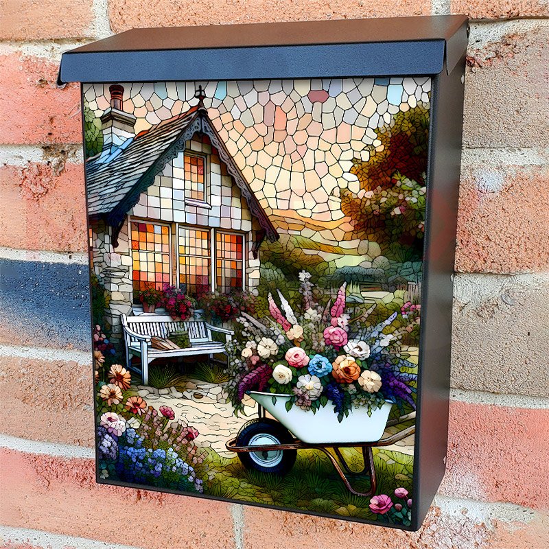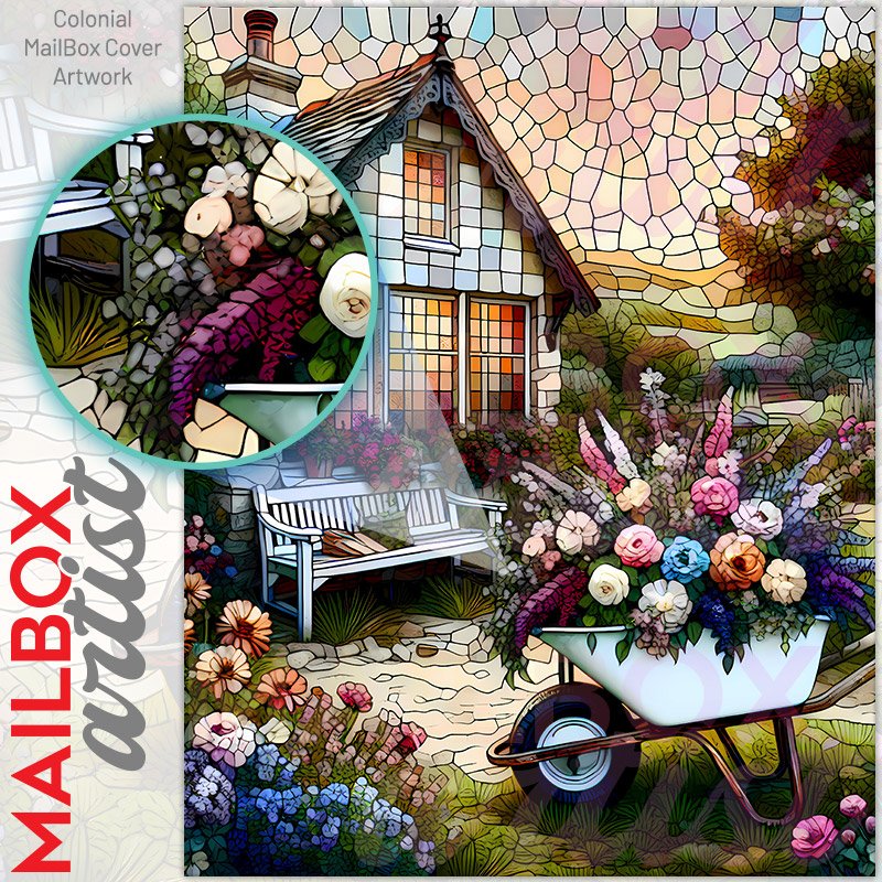 Stained Glass Cottage and Wheel Barrel Colonial Mailbox Cover