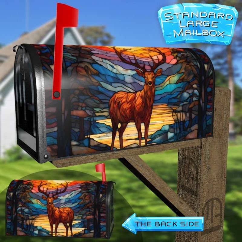 Dressing up your rural farm mailbox with the Stained Glass Deer Design mailbox cover is an easy way to convert it into a unique and special item. These covers require a smooth surface, so they are compatible with rural farm mailboxes that do not have any embossed decorations or signs. Magnetic mailbox covers work with steel boxes only, while self-adhesive vinyl covers are available for aluminum, plastic and steel boxes. If your mailbox is not compatible with these covers, you can purchase a brand new mailbox with a preinstalled cover. Additionally, you have the option to create a custom rural farm mailbox cover with your own pictures, name, street number, etc.