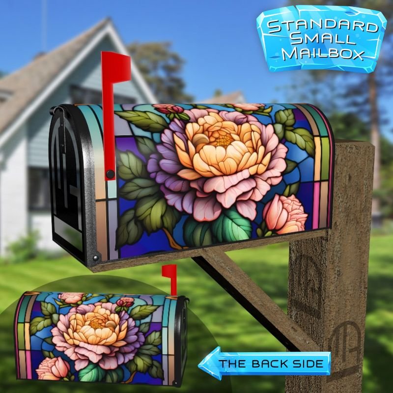 Dressing up your rural farm mailbox with the Stained Glass Dog Roses Design mailbox cover is an easy way to convert it into a unique and special item. These covers require a smooth surface, so they are compatible with rural farm mailboxes that do not have any embossed decorations or signs. Magnetic mailbox covers work with steel boxes only, while self-adhesive vinyl covers are available for aluminum, plastic and steel boxes. If your mailbox is not compatible with these covers, you can purchase a brand new mailbox with a preinstalled cover. Additionally, you have the option to create a custom rural farm mailbox cover with your own pictures, name, street number, etc.
