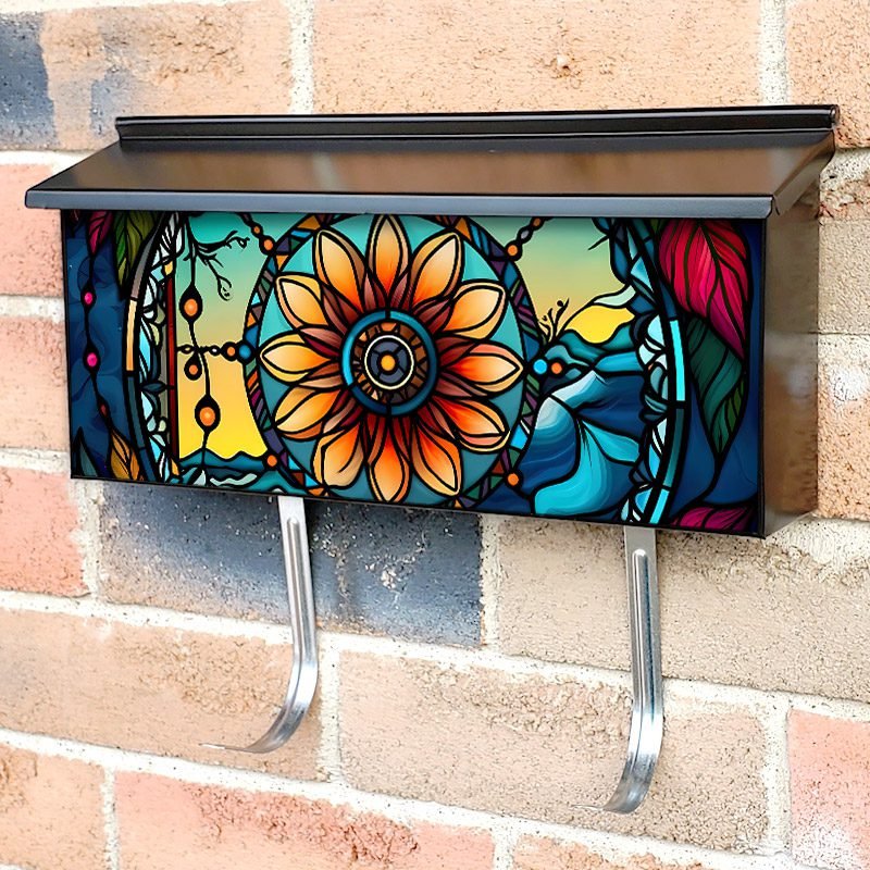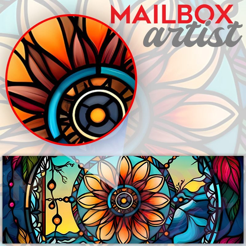 Applying your Stained Glass Dreamcatcher Design #2 townhouse / ranch mailbox cover it’s pretty easy to convert your mailbox to a special and unique item. These covers require a flat surface, so they work with townhouse / ranch mailboxes that do not have any embossed decoration or signs. Magnetic mailbox covers work with steel boxes, for aluminum and plastic boxes we offer the self-adhesive vinyl covers. In case your mailbox doesn’t work with these covers, you can purchase the preinstalled cover on a brand new mailbox as well. Also, you can create your custom townhouse / ranch mailbox cover using you own pictures, adding your name, street number, etc.