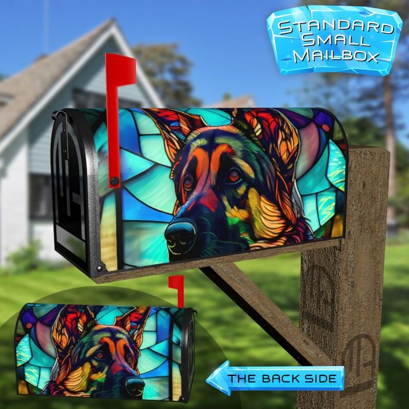 Dressing up your rural farm mailbox with the Stained Glass German Shepherd Design 2 mailbox cover is an easy way to convert it into a unique and special item. These covers require a smooth surface, so they are compatible with rural farm mailboxes that do not have any embossed decorations or signs. Magnetic mailbox covers work with steel boxes only, while self-adhesive vinyl covers are available for aluminum, plastic and steel boxes. If your mailbox is not compatible with these covers, you can purchase a brand new mailbox with a preinstalled cover. Additionally, you have the option to create a custom rural farm mailbox cover with your own pictures, name, street number, etc.