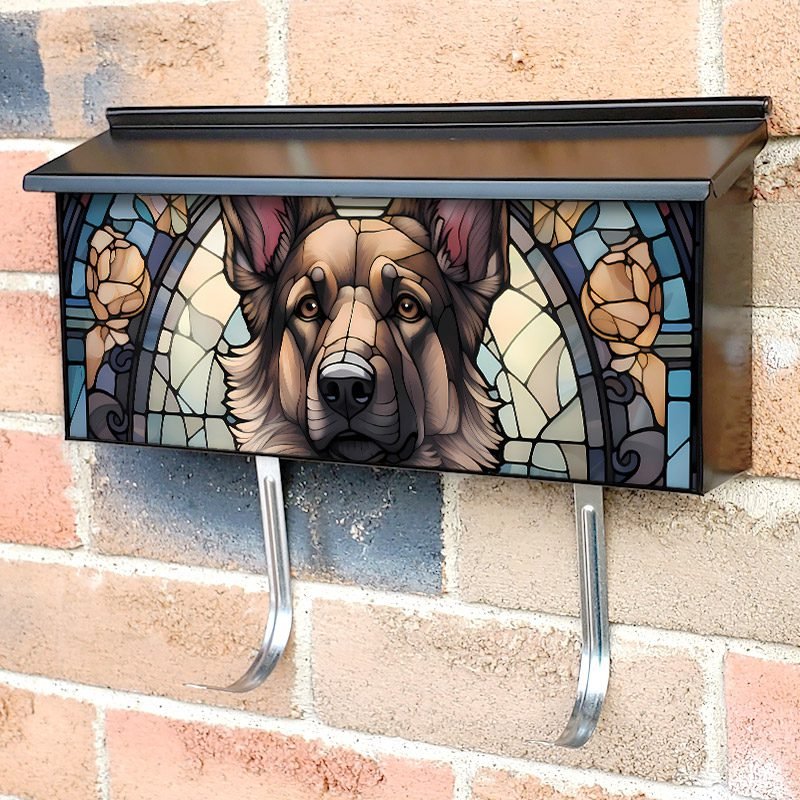 Applying your Stained Glass German Shepherd Design townhouse / ranch mailbox cover it’s pretty easy to convert your mailbox to a special and unique item. These covers require a flat surface, so they work with townhouse / ranch mailboxes that do not have any embossed decoration or signs. Magnetic mailbox covers work with steel boxes, for aluminum and plastic boxes we offer the self-adhesive vinyl covers. In case your mailbox doesn’t work with these covers, you can purchase the preinstalled cover on a brand new mailbox as well. Also, you can create your custom townhouse / ranch mailbox cover using you own pictures, adding your name, street number, etc.