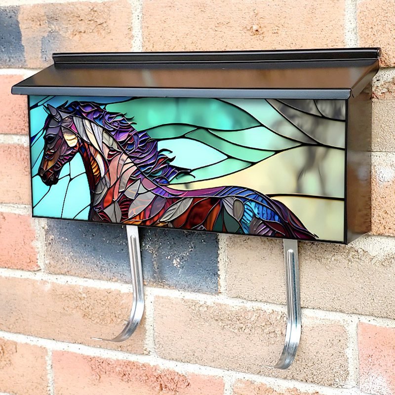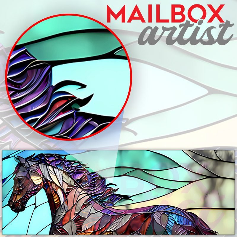 Applying your Stained Glass Horse Design #1 townhouse / ranch mailbox cover it’s pretty easy to convert your mailbox to a special and unique item. These covers require a flat surface, so they work with townhouse / ranch mailboxes that do not have any embossed decoration or signs. Magnetic mailbox covers work with steel boxes, for aluminum and plastic boxes we offer the self-adhesive vinyl covers. In case your mailbox doesn’t work with these covers, you can purchase the preinstalled cover on a brand new mailbox as well. Also, you can create your custom townhouse / ranch mailbox cover using you own pictures, adding your name, street number, etc.