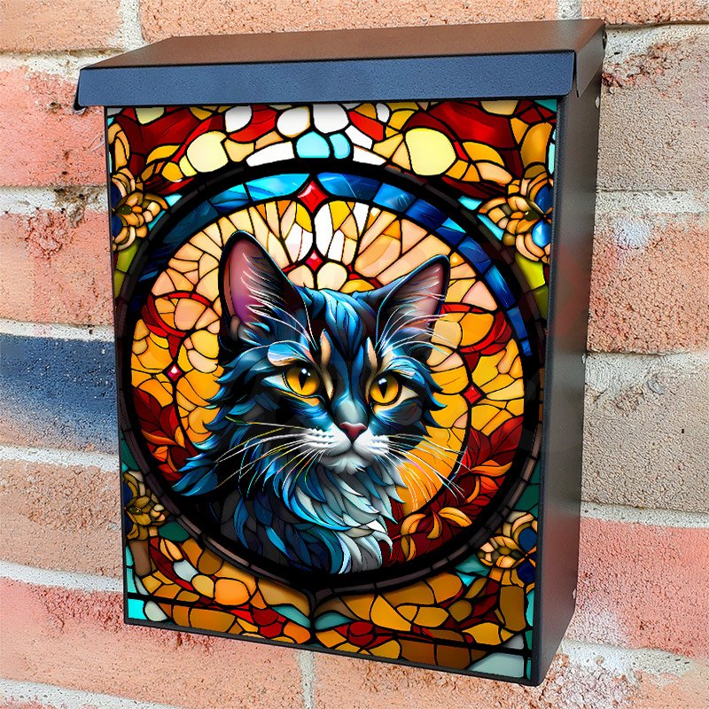 With this Stained Glass Kitten colonial mailbox cover it’s pretty easy to convert your mailbox to a special and unique item. These covers require a flat surface, so they work with colonial mailboxes that do not have any embossed decoration or signs. Magnetic mailbox covers work with steel colonial boxes only, while self-adhesive vinyl covers are available for aluminum, plastic and steel boxes. We also offer both self-adhesive and magnetic covers with regular opaque white vinyl or reflective vinyl, which works similarly to license plates or road signs. The reflective option makes the entire cover’s surface reflective, ensuring visibility at night. In case your mailbox doesn’t work with these covers, you can purchase the preinstalled cover on a brand new mailbox as well. Also, you can create your custom colonial mailbox cover using you own pictures, adding your name, street number, etc.