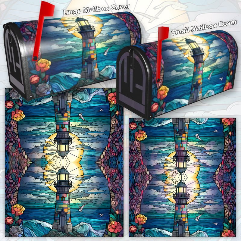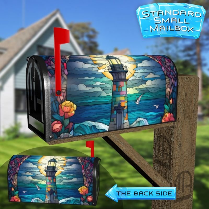 Dressing up your rural farm mailbox with the Stained Glass Lighthouse Design #2 mailbox cover is an easy way to convert it into a unique and special item. These covers require a smooth surface, so they are compatible with rural farm mailboxes that do not have any embossed decorations or signs. Magnetic mailbox covers work with steel boxes only, while self-adhesive vinyl covers are available for aluminum, plastic and steel boxes. If your mailbox is not compatible with these covers, you can purchase a brand new mailbox with a preinstalled cover. Additionally, you have the option to create a custom rural farm mailbox cover with your own pictures, name, street number, etc.