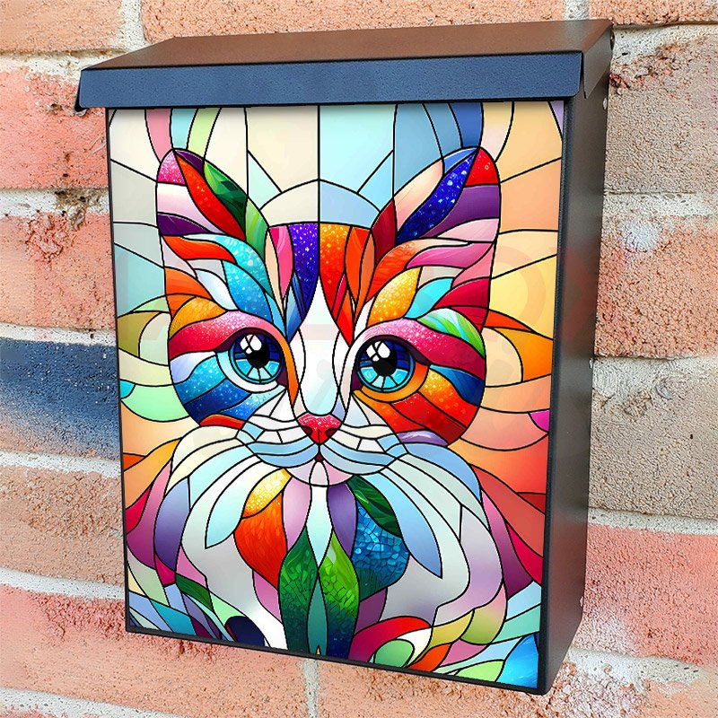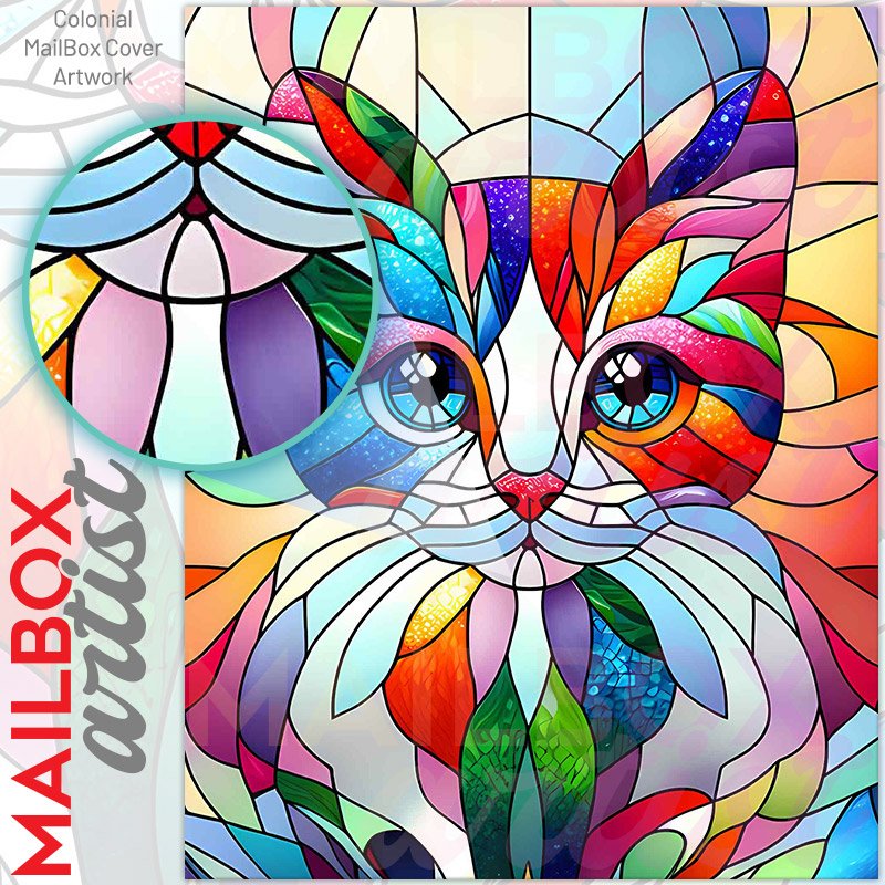 With this Stained Glass Little Kitten colonial mailbox cover it’s pretty easy to convert your mailbox to a special and unique item. These covers require a flat surface, so they work with colonial mailboxes that do not have any embossed decoration or signs. Magnetic mailbox covers work with steel colonial boxes only, while self-adhesive vinyl covers are available for aluminum, plastic and steel boxes. We also offer both self-adhesive and magnetic covers with regular opaque white vinyl or reflective vinyl, which works similarly to license plates or road signs. The reflective option makes the entire cover’s surface reflective, ensuring visibility at night. In case your mailbox doesn’t work with these covers, you can purchase the preinstalled cover on a brand new mailbox as well. Also, you can create your custom colonial mailbox cover using you own pictures, adding your name, street number, etc.