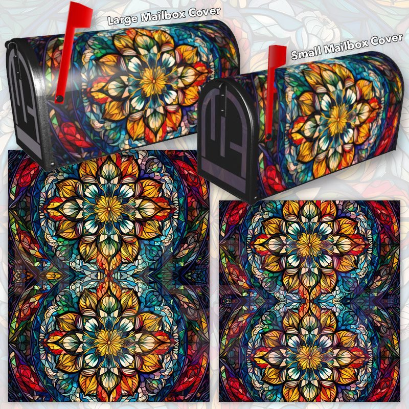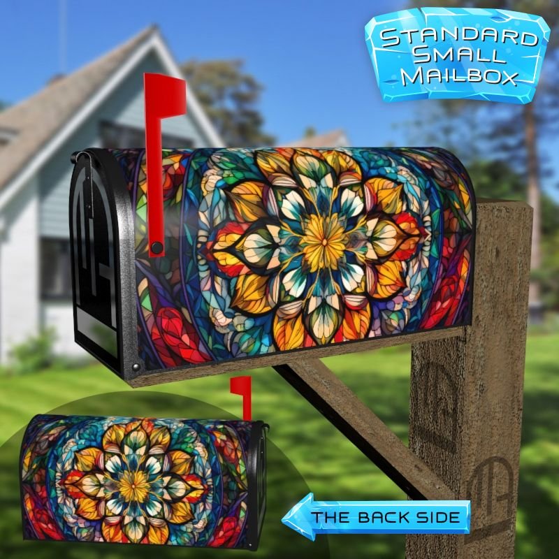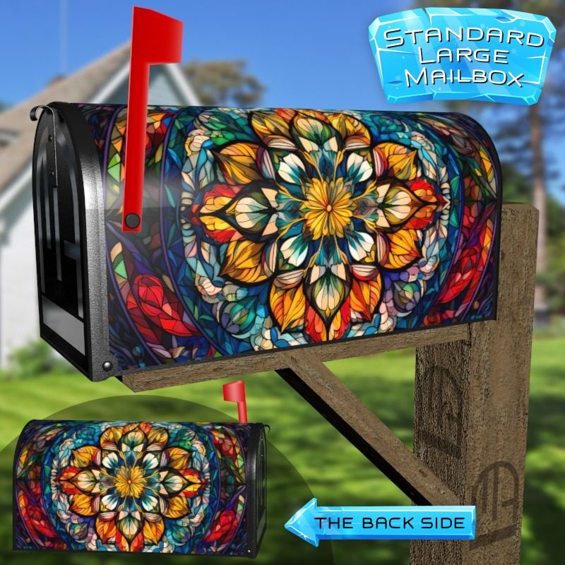 Dressing up your rural farm mailbox with the Stained Glass Mandala Design #1 mailbox cover is an easy way to convert it into a unique and special item. These covers require a smooth surface, so they are compatible with rural farm mailboxes that do not have any embossed decorations or signs. Magnetic mailbox covers work with steel boxes only, while self-adhesive vinyl covers are available for aluminum, plastic and steel boxes. If your mailbox is not compatible with these covers, you can purchase a brand new mailbox with a preinstalled cover. Additionally, you have the option to create a custom rural farm mailbox cover with your own pictures, name, street number, etc.