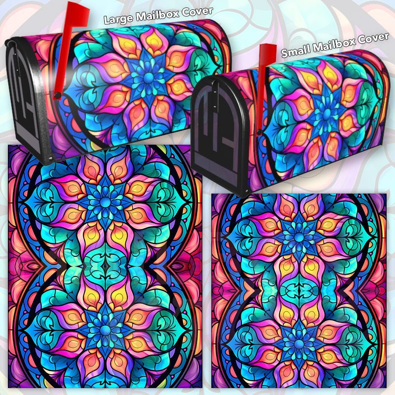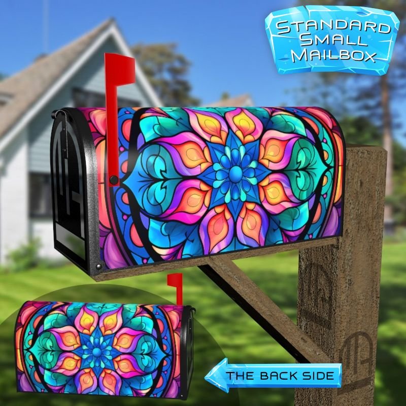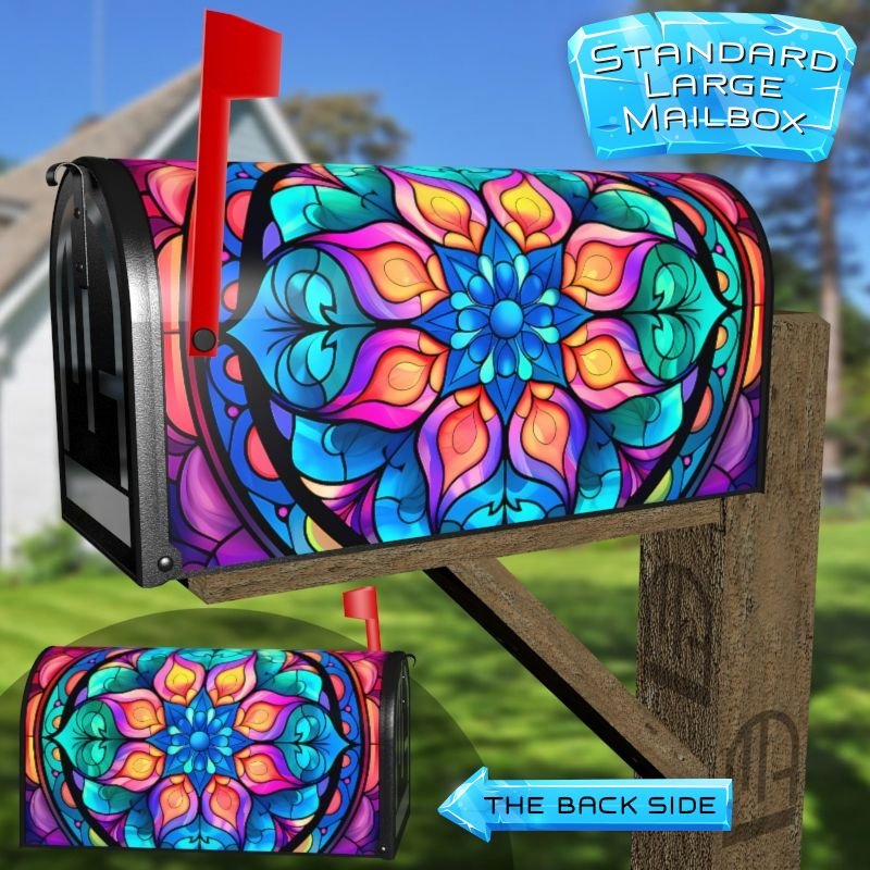 Dressing up your rural farm mailbox with the Stained Glass Mandala Design #2 mailbox cover is an easy way to convert it into a unique and special item. These covers require a smooth surface, so they are compatible with rural farm mailboxes that do not have any embossed decorations or signs. Magnetic mailbox covers work with steel boxes only, while self-adhesive vinyl covers are available for aluminum, plastic and steel boxes. If your mailbox is not compatible with these covers, you can purchase a brand new mailbox with a preinstalled cover. Additionally, you have the option to create a custom rural farm mailbox cover with your own pictures, name, street number, etc.