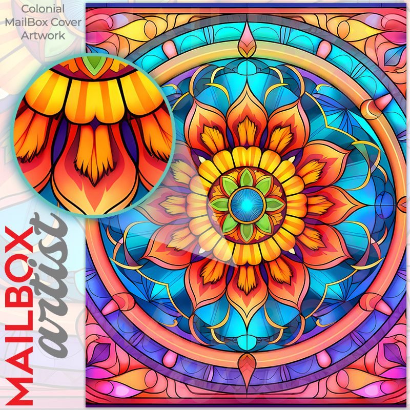 With this Stained Glass Mandala Design #4 colonial mailbox cover it’s pretty easy to convert your mailbox to a special and unique item. These covers require a flat surface, so they work with colonial mailboxes that do not have any embossed decoration or signs. Magnetic mailbox covers work with steel colonial boxes only, while self-adhesive vinyl covers are available for aluminum, plastic and steel boxes. We also offer both self-adhesive and magnetic covers with regular opaque white vinyl or reflective vinyl, which works similarly to license plates or road signs. The reflective option makes the entire cover’s surface reflective, ensuring visibility at night. In case your mailbox doesn’t work with these covers, you can purchase the preinstalled cover on a brand new mailbox as well. Also, you can create your custom colonial mailbox cover using you own pictures, adding your name, street number, etc.