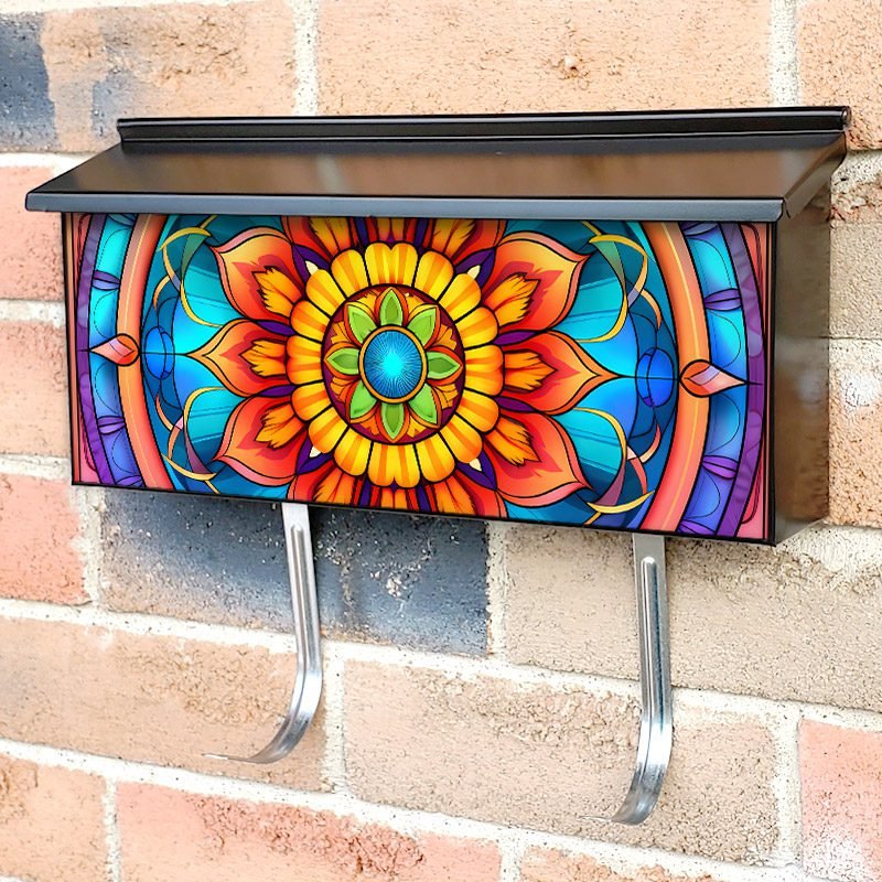 Applying your Stained Glass Mandala Design #4 townhouse / ranch mailbox cover it’s pretty easy to convert your mailbox to a special and unique item. These covers require a flat surface, so they work with townhouse / ranch mailboxes that do not have any embossed decoration or signs. Magnetic mailbox covers work with steel boxes, for aluminum and plastic boxes we offer the self-adhesive vinyl covers. In case your mailbox doesn’t work with these covers, you can purchase the preinstalled cover on a brand new mailbox as well. Also, you can create your custom townhouse / ranch mailbox cover using you own pictures, adding your name, street number, etc.