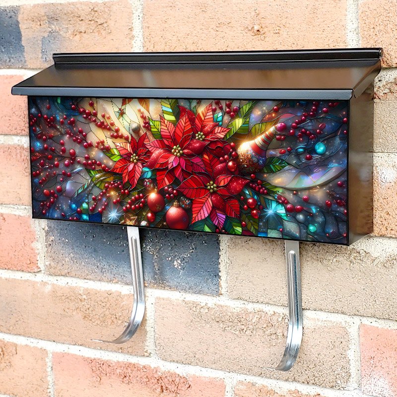 Applying your Stained Glass Poinsettias townhouse / ranch mailbox cover it’s pretty easy to convert your mailbox to a special and unique item. These covers require a flat surface, so they work with townhouse / ranch mailboxes that do not have any embossed decoration or signs. Magnetic mailbox covers work with steel boxes, for aluminum and plastic boxes we offer the self-adhesive vinyl covers. In case your mailbox doesn’t work with these covers, you can purchase the preinstalled cover on a brand new mailbox as well. Also, you can create your custom townhouse / ranch mailbox cover using you own pictures, adding your name, street number, etc.