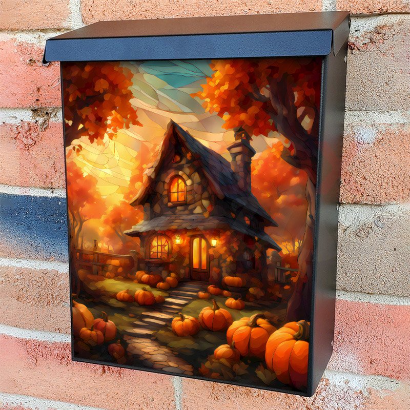 With this Stained Glass Pumpkin Cottage colonial mailbox cover it’s pretty easy to convert your mailbox to a special and unique item. These covers require a flat surface, so they work with colonial mailboxes that do not have any embossed decoration or signs. Magnetic mailbox covers work with steel colonial boxes only, while self-adhesive vinyl covers are available for aluminum, plastic and steel boxes. We also offer both self-adhesive and magnetic covers with regular opaque white vinyl or reflective vinyl, which works similarly to license plates or road signs. The reflective option makes the entire cover’s surface reflective, ensuring visibility at night. In case your mailbox doesn’t work with these covers, you can purchase the preinstalled cover on a brand new mailbox as well. Also, you can create your custom colonial mailbox cover using you own pictures, adding your name, street number, etc.